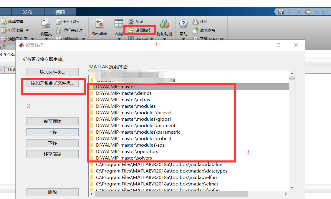 选择“添加并包含子文件夹”,将 yalmip 的路径(如D:\YALMIP-Master)添加进去。