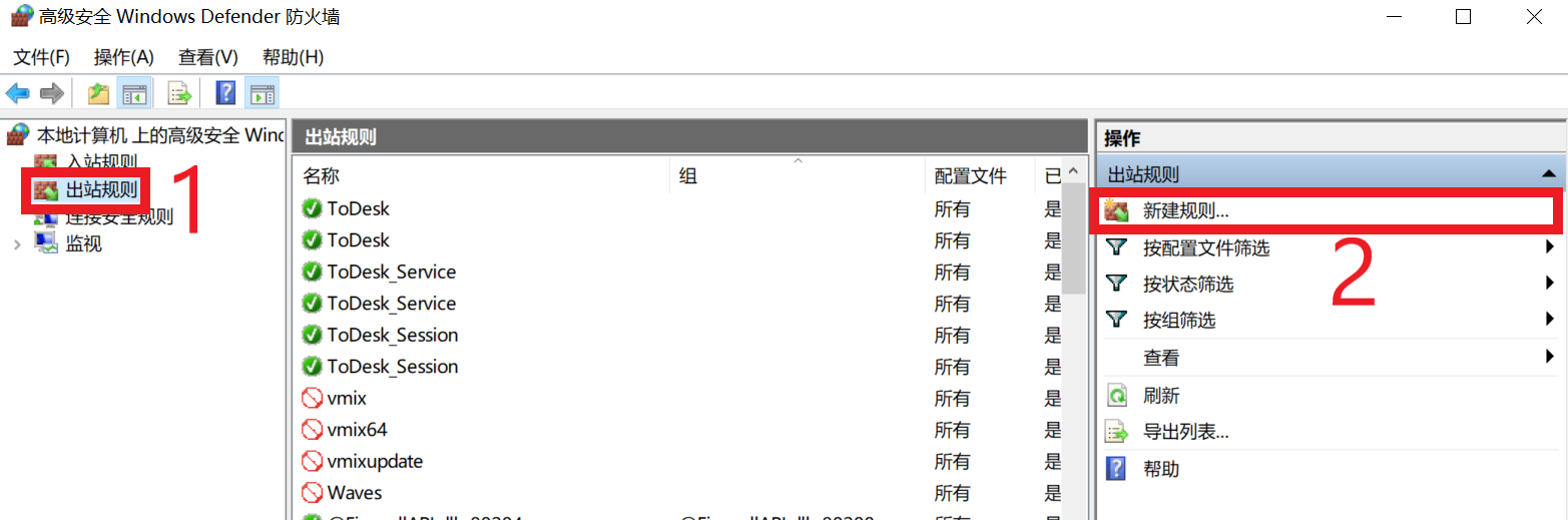 wf.msc并回车,准备建立防火墙规则。选择左侧“出站规则”,点击右侧“新建规则”,在弹出窗口中选择“程序”后点击下一步,单击此程序路径下“浏览”,在地址栏输入C:\Program Files (x86)\vMix后回车,选择vmix.exe点击打开并一直下一步,名称填写vmix后点击完成。同理,再将vmix64.exe添加按上述步骤进规则,名称填写vmix64.exe;