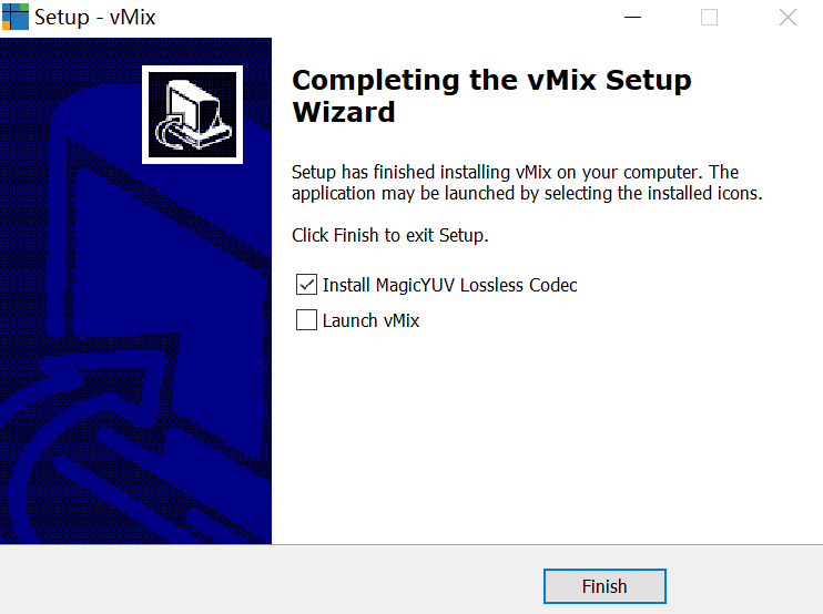 C:\Program Files (x86)\vMix安装软件; - 安装完成后在下图提示框内勾选“Install MagicYUV”、取消勾选“Launch vMix”,然后进入另一个安装程序,按照提示完成安装;